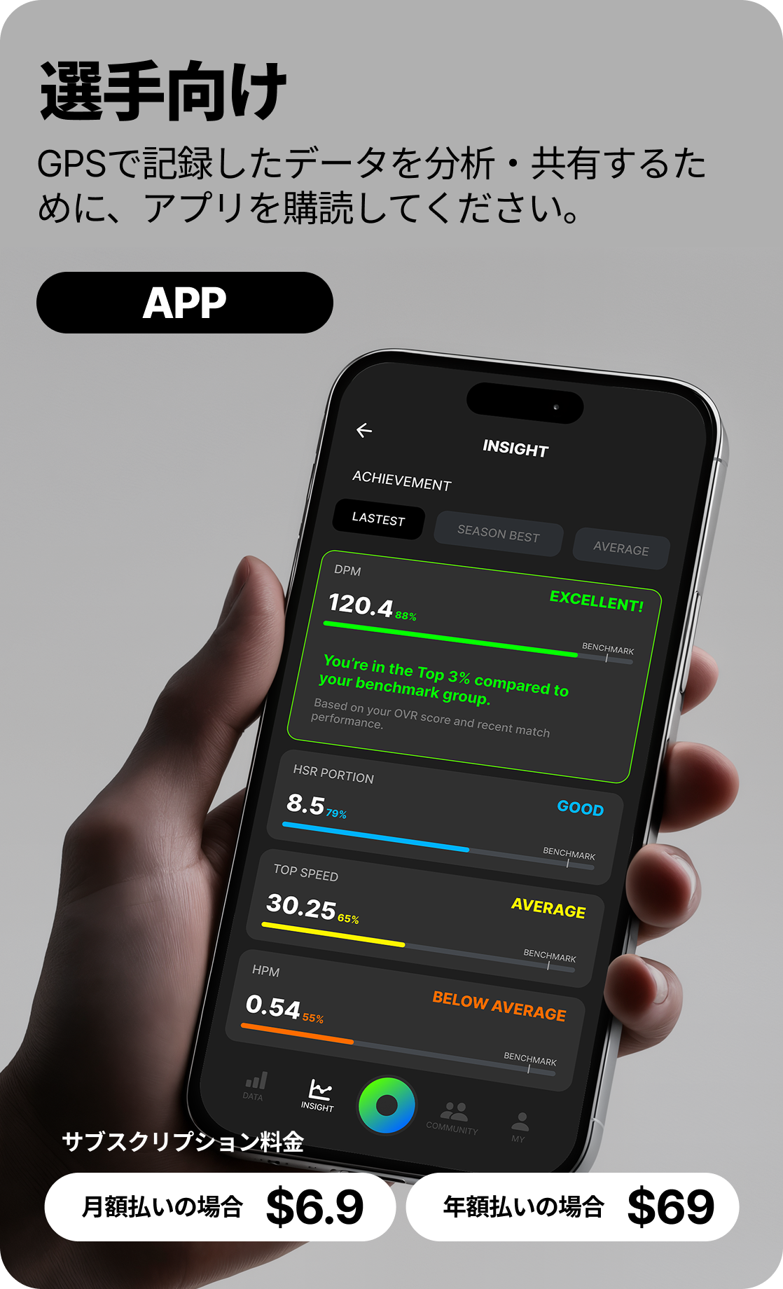 分析結果が正確でないように感じます。 BEEの文字が正しい向きで見えるか確認し、デバイスの向きを合わせてベストのポケットに入れてください。 ステップ2(フィールドエリア)で、すべてのGPSポイントを覆うようにフィールド範囲が設定されているか確認してください。 ステップ4でセッション数、時間、ポジションが正しく入力されているか確認してください。1分あたりの移動距離グラフでスパイクの高い部分は実際のプレー時間と一致する必要があります。