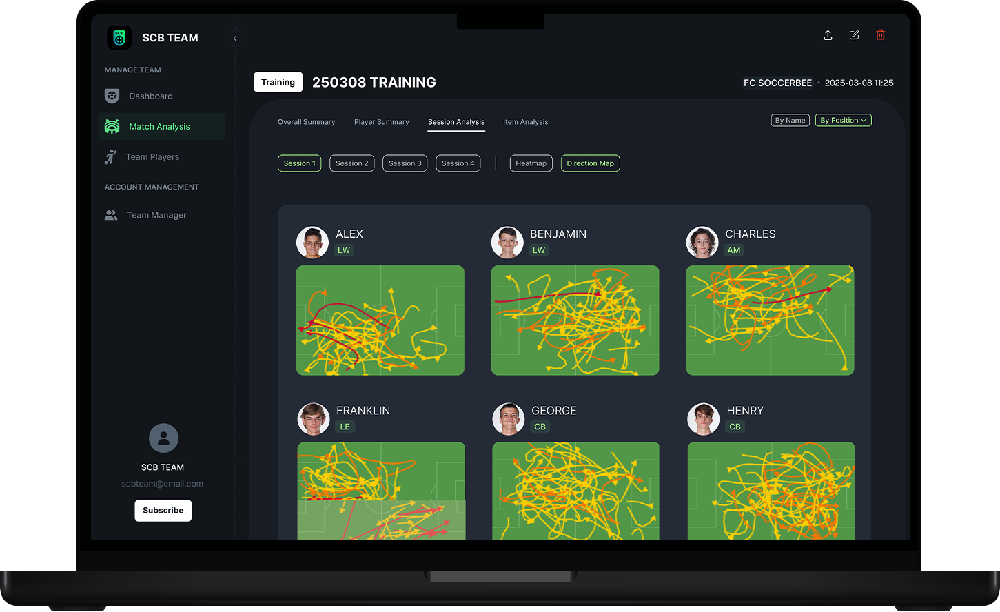 SCB Teamを利用するには、選手がまずSOCCERBEEを個人で使用する必要があります。各選手のアプリからデータがアップロードされ、その後コーチがアクセスできるようになります。